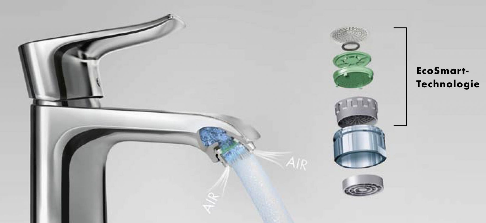 Der EcoSmart Luftsprudler ist in den Auslauf des Waschtischmischers integriert und reichert das Wasser mit Luft an. Das Ergebnis ist ein satter, sprudelnder Wasserstrahl. Ein „Präzisions-Elastomer“ reagiert automatisch auf unterschiedlichen Wasserdruck und verändert seine Form. Er begrenzt den Durchfluss und spart so konstant Trinkwasser.